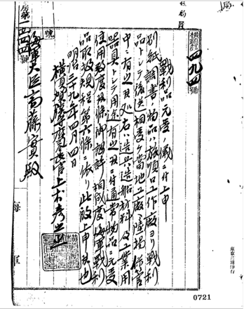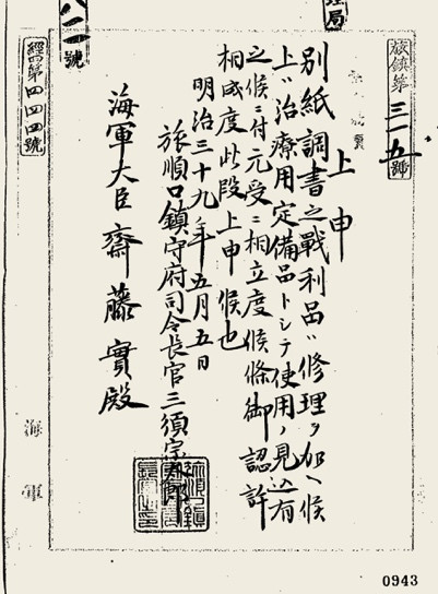 日军三任旅顺镇守府司令长官分别于1905年5月、1908年6月、1908年12月致日本海军大臣斋藤实关于运送“战利品”的函件