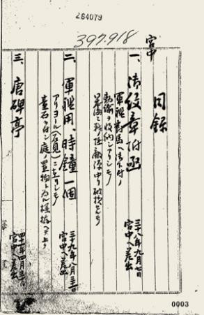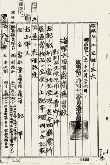 1908年日本编制的《明治三十七八年战役战利品寄赠书类》中明确记载“唐碑亭,四十一年四月三十日送至宫中。附言:该物品原位于旅顺黄金山麓。”这是日本将唐鸿胪井碑作为日俄战争战利品劫掠至日本的最关键证据。